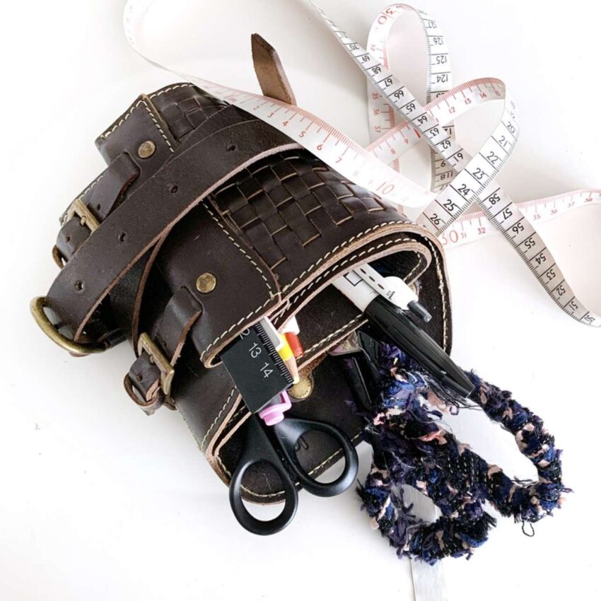 長年愛用しております断裁道具を収めるベルト付きのケース。日頃はこれを腰に巻いてお仕事をしております。元々は美容師さん向けのケースなのですが、底部にウレタンを入れて裁ちばさみの重みで先端が痛まないように少しカスタマイズしています。ひたすら断裁...
