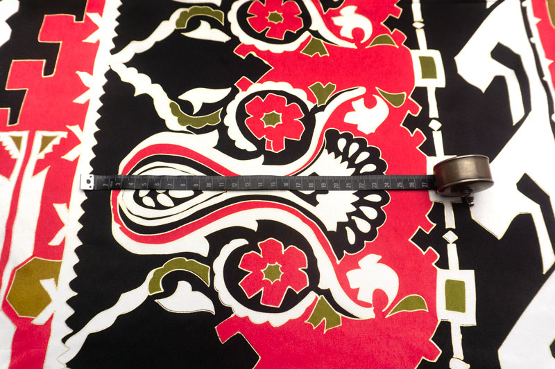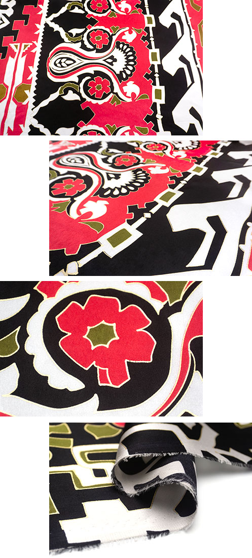 上質なシルクサテンに、大胆なアズテク調柄と花柄をプリントであしらった、遊び心のあるお生地です。