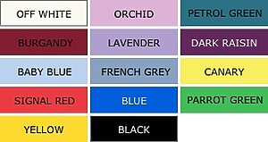 オフホワイトやオーキッド、ペトロールグリーン、バーガンディ、ラベンダー、ダークレーズン、ベビーブルー、フレンチグレー、カナリー