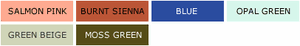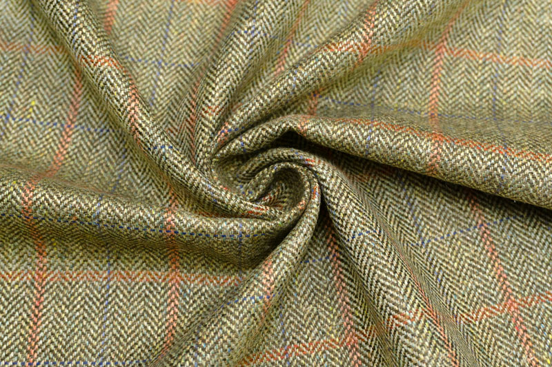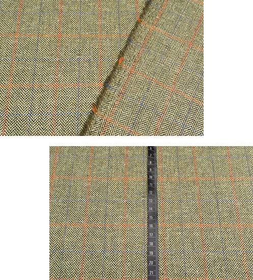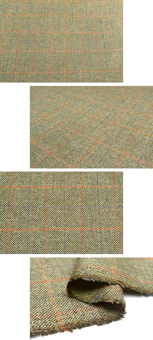 バーントシェンナやブルー、オパールグリーン、グリーンベージュ、モスグリーンなど、様々な色が混ざり合うヘリンボンのベースに、