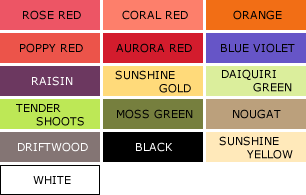 ポピーレッド、オーロラレッド、ブルーバイオレット、レーズン、サンシャインゴールド、ダイキリグリーン、テンダーシューツ、モスグリーン、