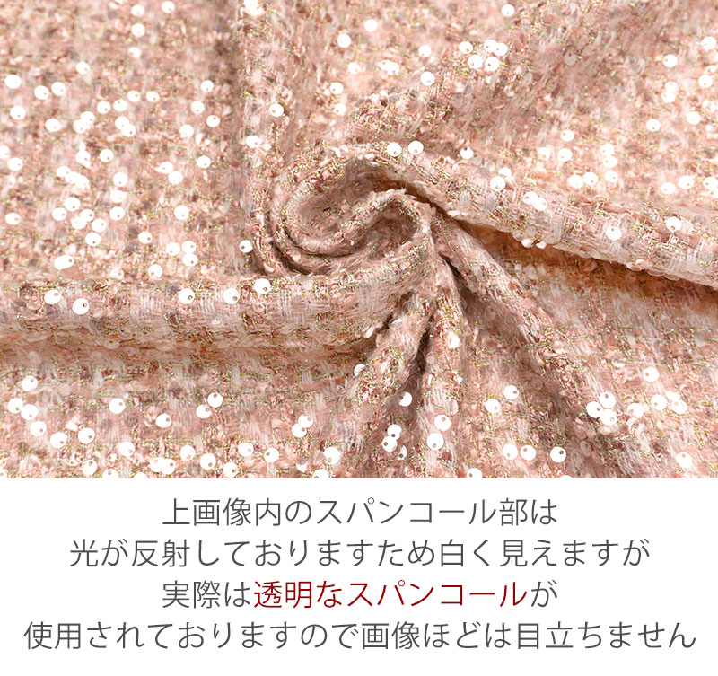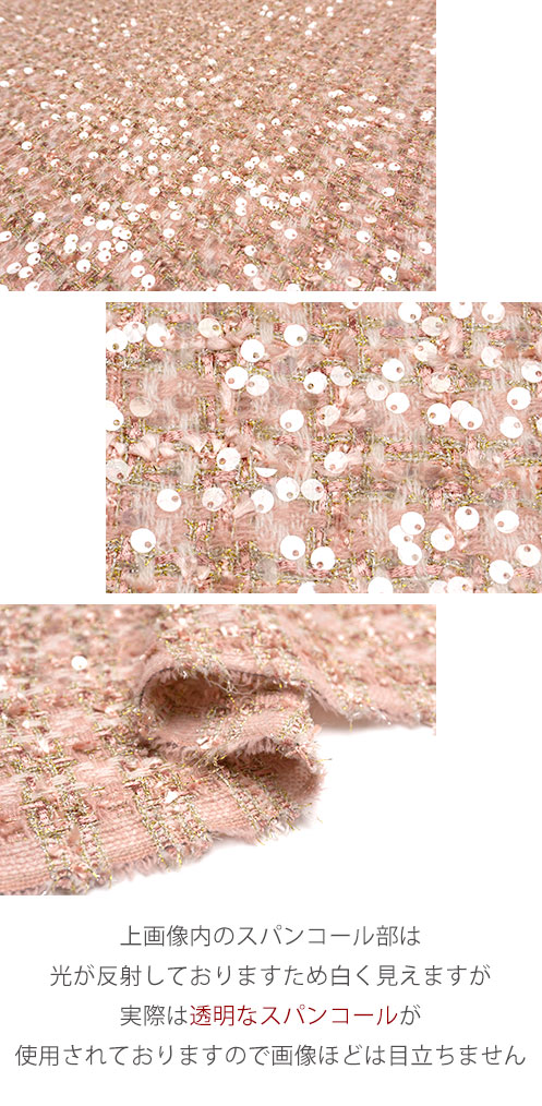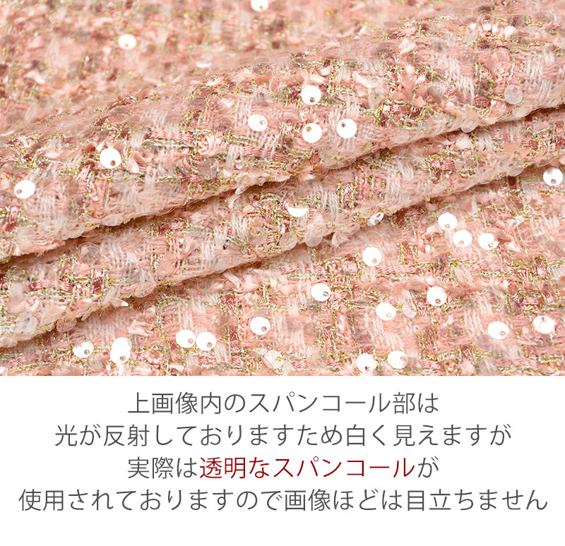柔らかなピンクに、透明なスパンコールが角度によってきらめくツイードです。