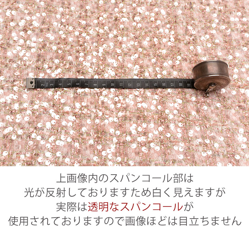 *スパンコールの有効幅(スパンコールが付いている幅)は、生地幅142cmの内 124cmとなります。