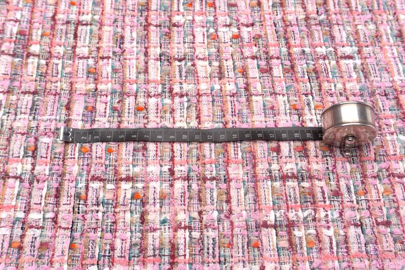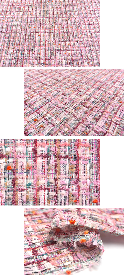 ヤーンなどをゆったりとチェック状に行き交わせて、ホワイトやフレッシュ、ショッキングピンクの普通糸で織り止めた逸品。